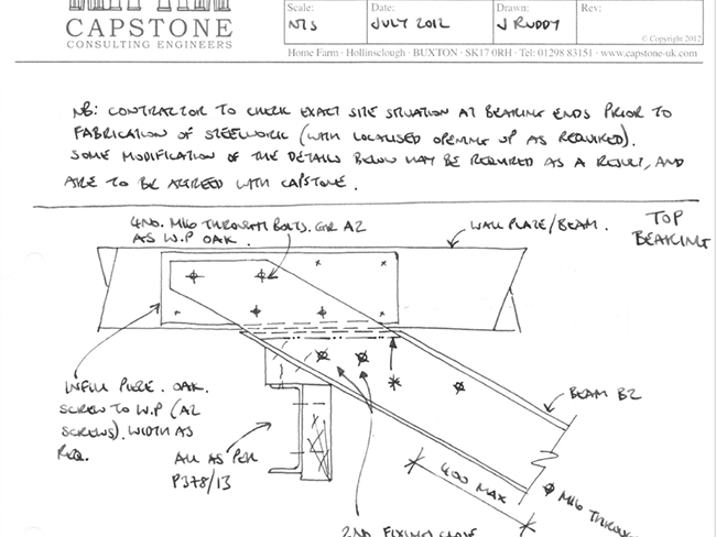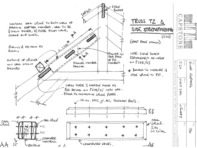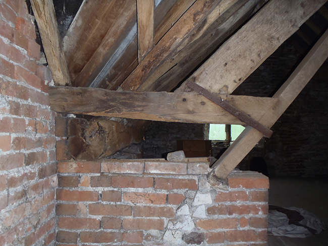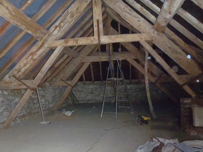 In the case of this building, the main issue was loss of strength of the wonderful Seventeenth Century roof trusses, wall plates, and purlins, mostly due to past beetle attack (decay) and some ill-conceived past alterations.